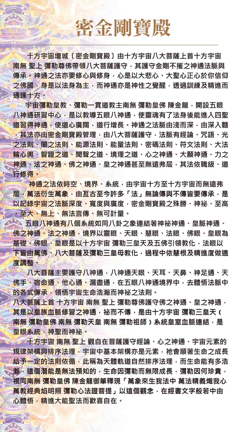 • 1.世界上唯一由肉身教主 彌勒皇佛 陳金龍親自創建,也是宇宙天國唯一認證的宗教。